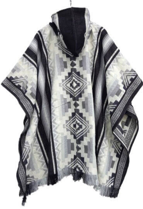 Hooded poncho with geometric design, inspired by traditional patterns. Soft and warm fabric in shades of gray, black, and cream. Loose fit for added comfort, with decorative fringe on the bottom edge. Ideal for a casual, bohemian, or light winter look.